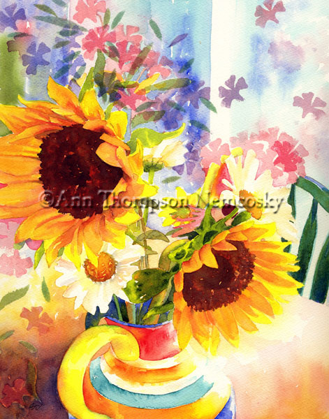 This painting celebrates the cheerfulness of sunflowers accompanied by daisies and phlox in a brightly colored pitcher that graced my summertime table. I was inspired to enhance the liveliness of the blooms with a repeat blossom and leaf pattern dancing throughout the composition. I especially liked the light streaming in from behind the flowers as well as the unusual angle of the photo, with the pitcher and table in a slightly skewed perspective. That was my starting point for playing with this composition. I had previously sketched this same flower arrangement here. If you are interested in my process for this painting, keep reading. . .